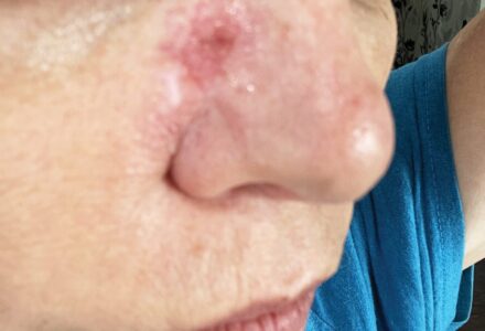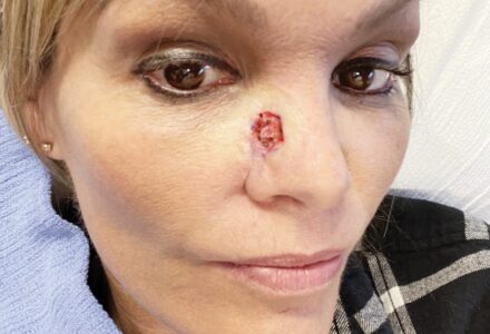 Mohs surgery, October 2024: Cassidy’s progress from before surgery to biopsy, tumor removal before closure, her nose the next morning, and one week after the stitches were removed.